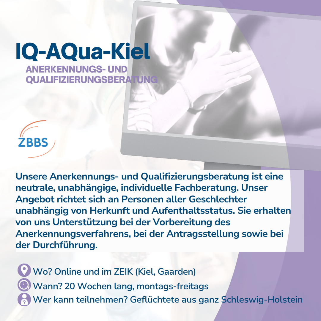 Heute lernt ihr das Projekt „IQ-AQua-Kiel“ kennen, eine Anerkennungs- und Qualifizierungsberatung, das Geflüchtete bei der Vorbereitung des Anerkennungsverfahrens, bei der Antragstellung und der Durchführung unterstützt und begleitet.
