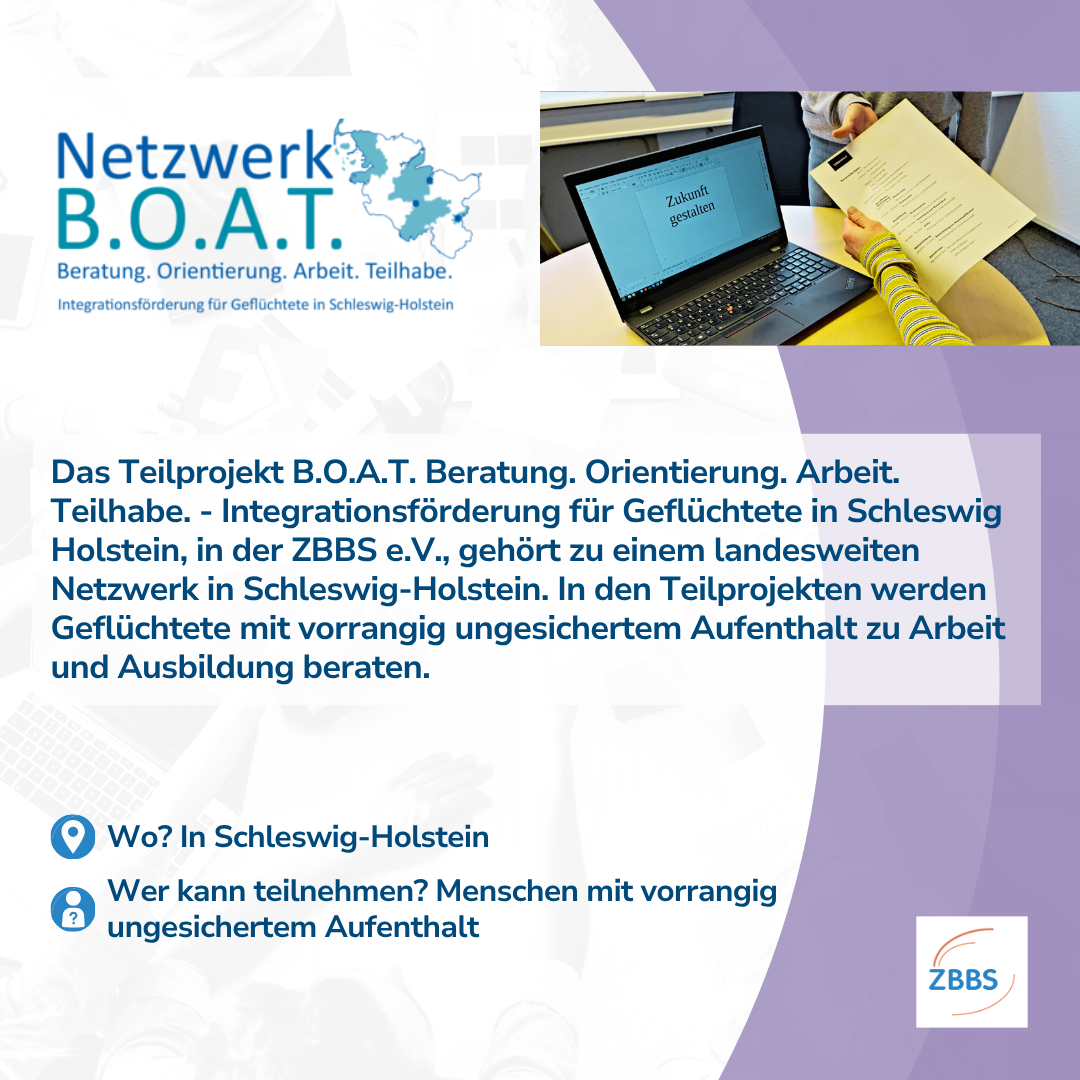 Heute lernt ihr das Netzwerk B.O.A.T. (Beratung. Orientierung. Arbeit. Teilhabe.) kennen. Das Teilprojekt gehört zu einem landesweiten Netzwerk in Schleswig-Holstein. In den Teilprojekten werden Geflüchtete mit vorrangig ungesichertem Aufenthalt zu Arbeit und Ausbildung beraten.