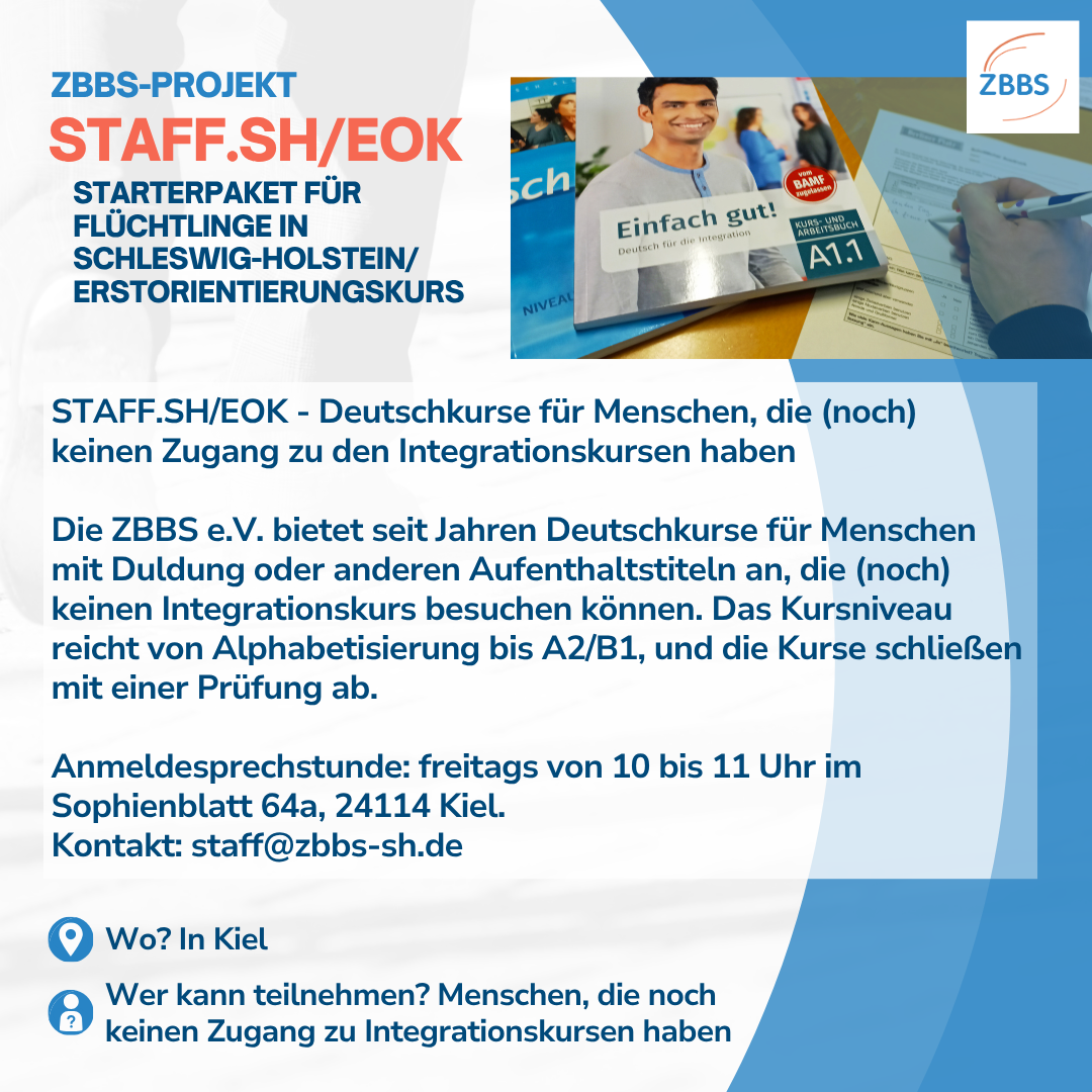 Heute lernt ihr das Projekt „STAFF.SH/ EOK“ kennen, ein Angebot für Deutschkurse für Menschen, die (noch) keinen Zugang zu den Integrationskursen haben.